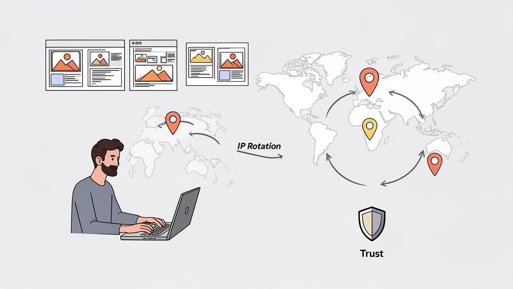 By rotating through different clean IPs for each task, you avoid creating a predictable footprint and can maintain separate, untraceable profiles for every campaign. If you want to dive deeper into more advanced techniques, our guide on https://proxypurpose.io/blogs/proxy-ip-rotation is a great place to start. Adopting this approach is fundamental to scaling your operations with confidence.